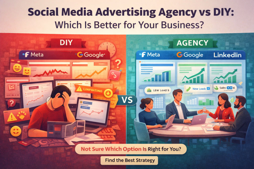 Social media advertising agency vs DIY comparison showing self-managed ads vs expert agency strategy, performance, and growth across Meta, Google, and LinkedIn
